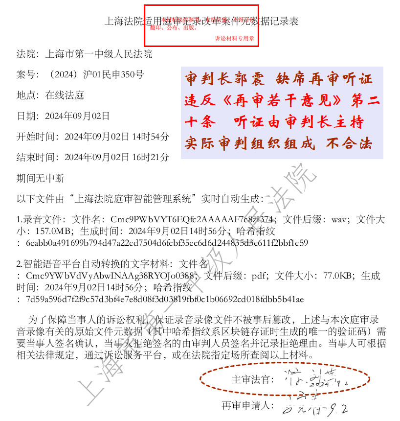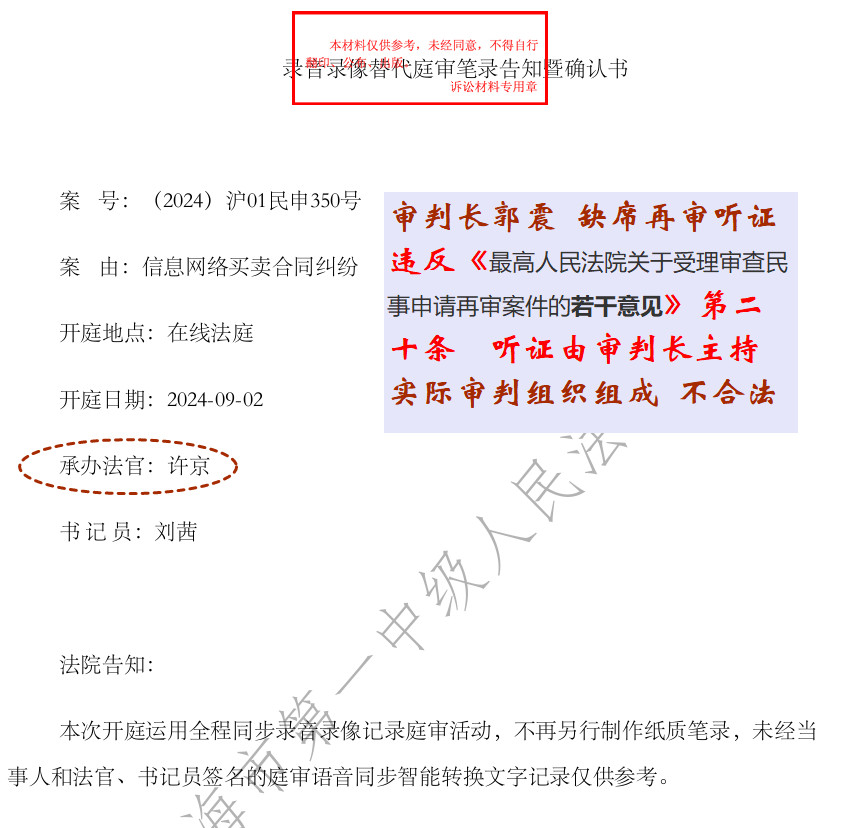 2.【违法事实】听证实际主持人许京(非审判长),并且只有一人,缺席2人(郭震、魏海虹)。审判长郭震缺席再审听证,许京没有资格主持听证。